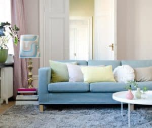 10. In a room full of solids, a single multicolor pattern provides all the pop you need. This lampshade repeats the custom couch’s soft serenity hue, but it also winds the color around neutral white and rose quartz to pull the whole room together.