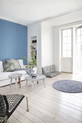 5. Stick to a single accent wall and let the paint do all the work for you. This dose of Serenity joins a jolt of green leaves to provide the only color in the whole room, but it’s more than enough to balance out the white flooring, ceiling, living room furniture, and other neutral details.