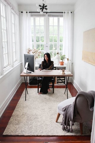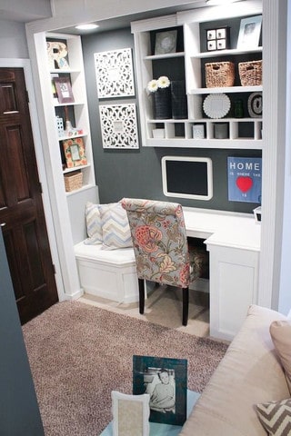 Okay, so you don’t have an extra room with four walls. What about the rooms you do have? Multipurpose furniture, such as a simple white table that doubles as a desk, will blend in with existing shelves and surfaces. For example, this all-white office space fits seamlessly with the room’s white walls. Your large family room or living room may have a wall or corner that gets a lot of light but isn’t being used. Consider placing your desk there.