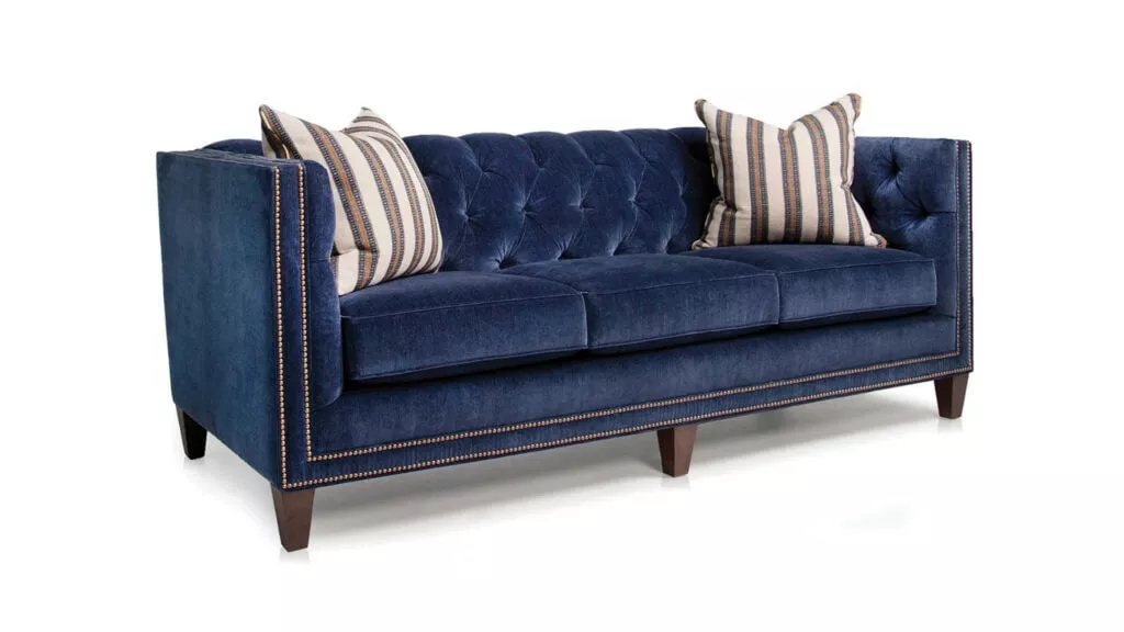 This sofa from Smith Brothers features built-in tapered legs, shagbark wood finish, and antique brass nailhead trim. Its tufted design is best suited for solid or textured fabrics. The three-seat cushion ensures comfort and style in any living space.
