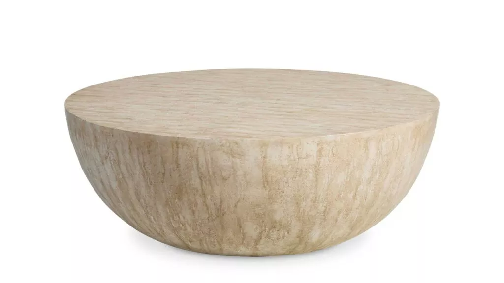 The Bora Bora Cocktail Table from Bassett features a drum design with a faux travertine finish. It adds a sculptural and textural element to your space. This durable piece is perfect for a modern look.