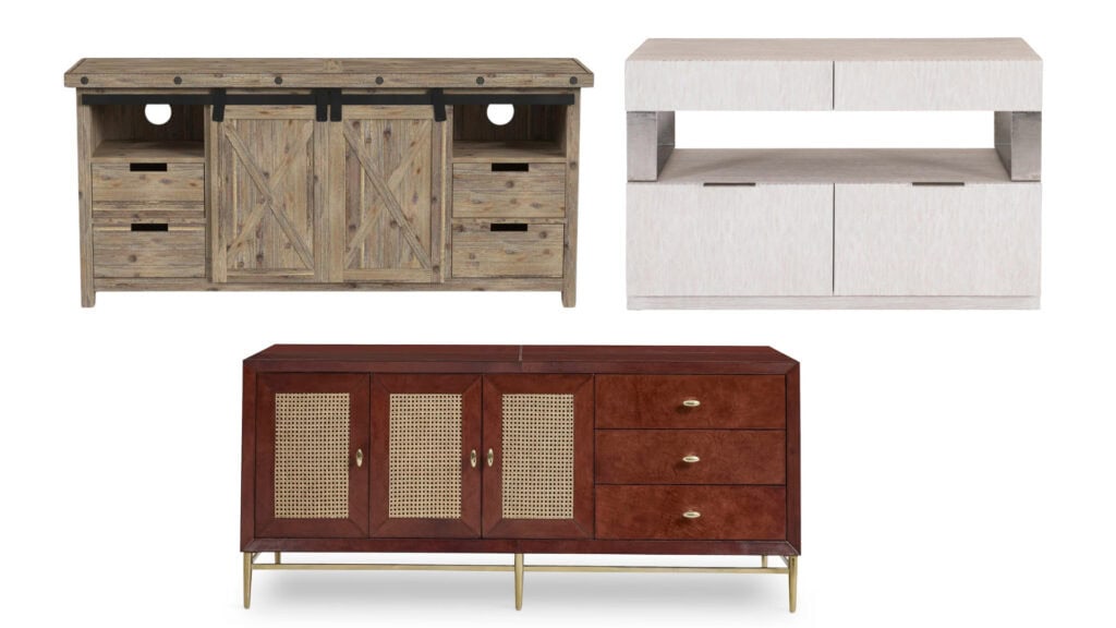 Though originally crafted for TV viewing, the Carpenter Brown Entertainment Base doubles as a spacious, rustic-chic storage unit. Sliding barn doors add interest, while the distressed acacia wood and metal frame create an industrial edge. With removable shelves and roomy compartments, it’s a versatile piece for any modern office.