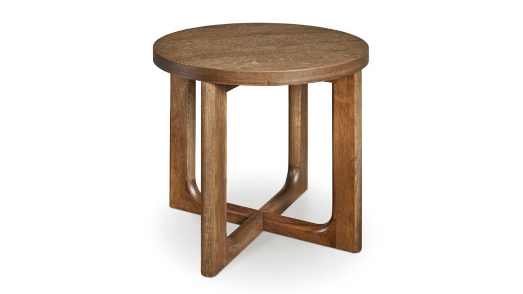 The Reston End Table offers a simple yet stylish design with its natural oak grain and x-shaped base. This table comes in various sizes and shapes, making it an easy piece to customize for your living room or reading nook.