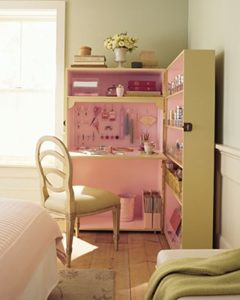 Small shoe cabinets and children’s bookshelves are convenient heights for desk “legs”, but you may also add risers to smaller furniture or cut taller bookshelves in half.