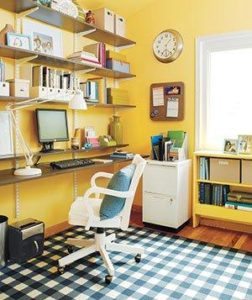 Are you making the most of your vertical storage space? If your walls are bare but your floors are cluttered with various pieces of furniture, then it might be time to phase out your desk in favor of versatile staggered shelves. Mount a long, wide shelf at waist height to serve as your work surface, and stagger smaller shelves around it to hold your equipment and supplies. Hide magnetic knife racks beneath some shelves, and use magnets, hooks, and paperclips to hang important notes and supplies right where you need them.