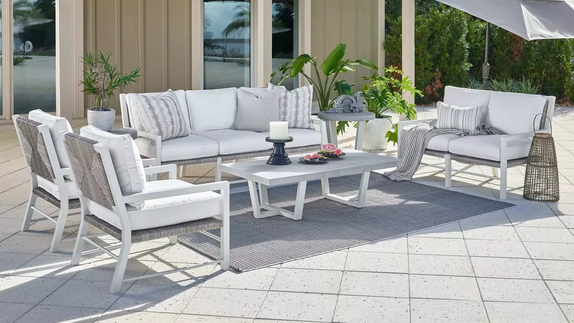 Complete the look with a mix of outdoor pillows, a weather-resistant rug, and accent tables for added convenience.
