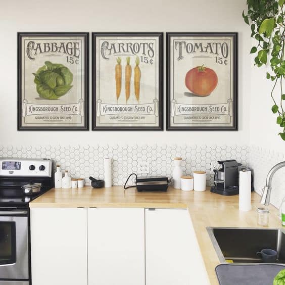 Personalize your space with artwork that serves a purpose. One idea is to create a single large focal point, which is a trick that works wonders in a kitchen.