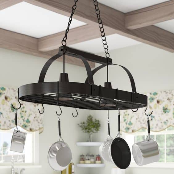 This is an essential way to free up some cabinet space by hanging your pots up. Not only does it give you some extra storage space, but it’s a trendy look, too.