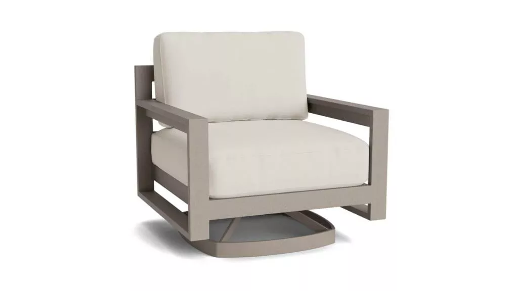 Relax in style with the Bonavista Outdoor Track Arm Swivel Rocker. This chair offers a cozy, rocking experience with its stable base and commercial-quality aluminum frame. Choose from six frame finishes and outdoor fabrics, and pair it with the Bonavista Ottoman for added comfort.