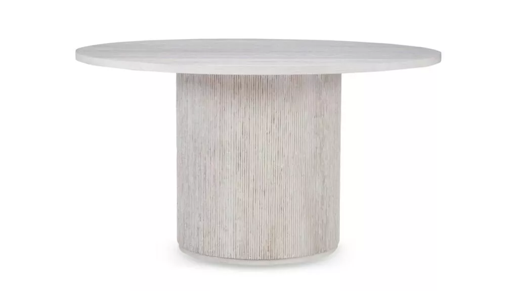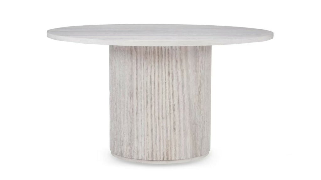 The Corbin Round Dining Table is ideal for cozy gatherings. Its 54″ white oak veneer top pairs beautifully with a cast stone composite base, creating a blend of modern and organic textures. The vintage white finish highlights the oak’s natural grain and intricate detailing.