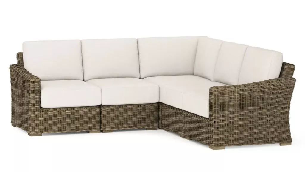 The Huntington Outdoor Dove Gray L-Shaped Sectional is perfect for entertaining, featuring a versatile design that complements any decor. Its six-piece wicker design is durable enough for outdoor use yet stylish enough for sunrooms and indoor spaces.