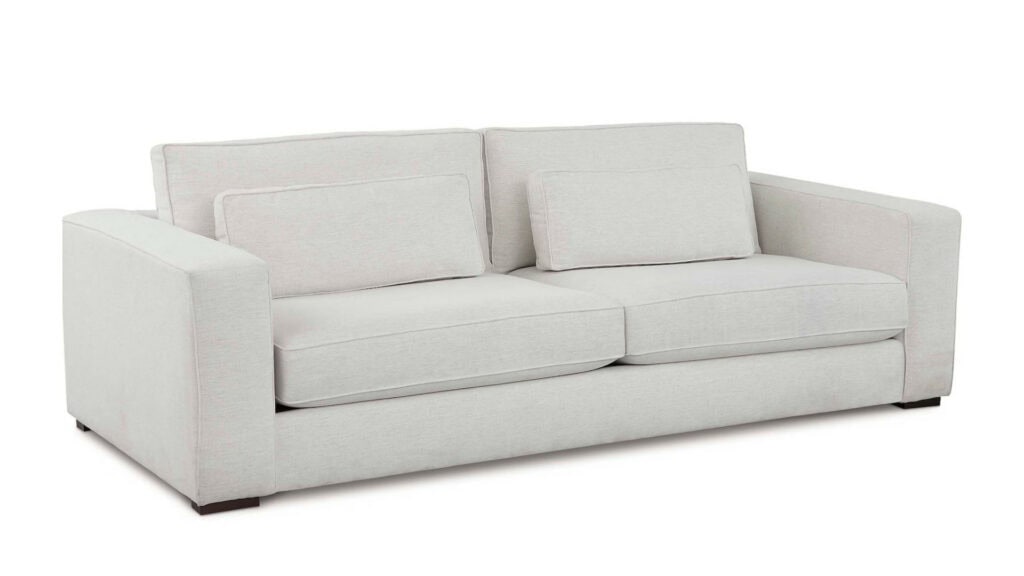 The Moby Track Arm Sofa features deep seating and a low-profile design for a modern look. With large, plush cushions and walnut-finished wood legs, this sofa is available in various fabrics like Alley Oyster, Stone, and more.