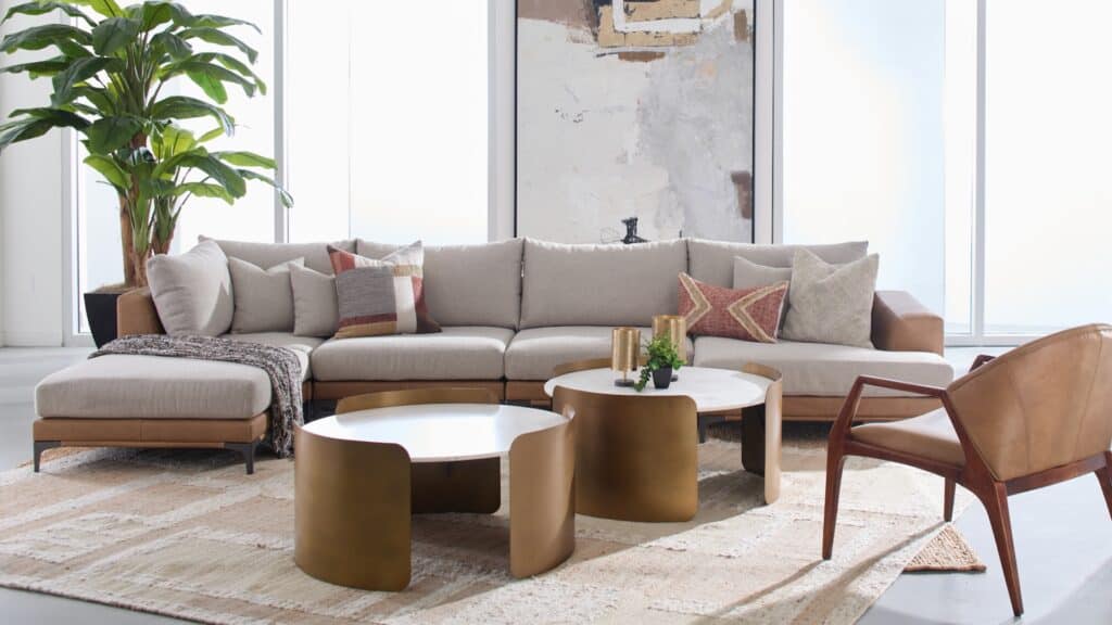 Complement the sofa with Universal’s Mallorca Cocktail Table, featuring a sturdy open-air body in a crisp white finish and a removable tray for storing small decor, remotes, and more.